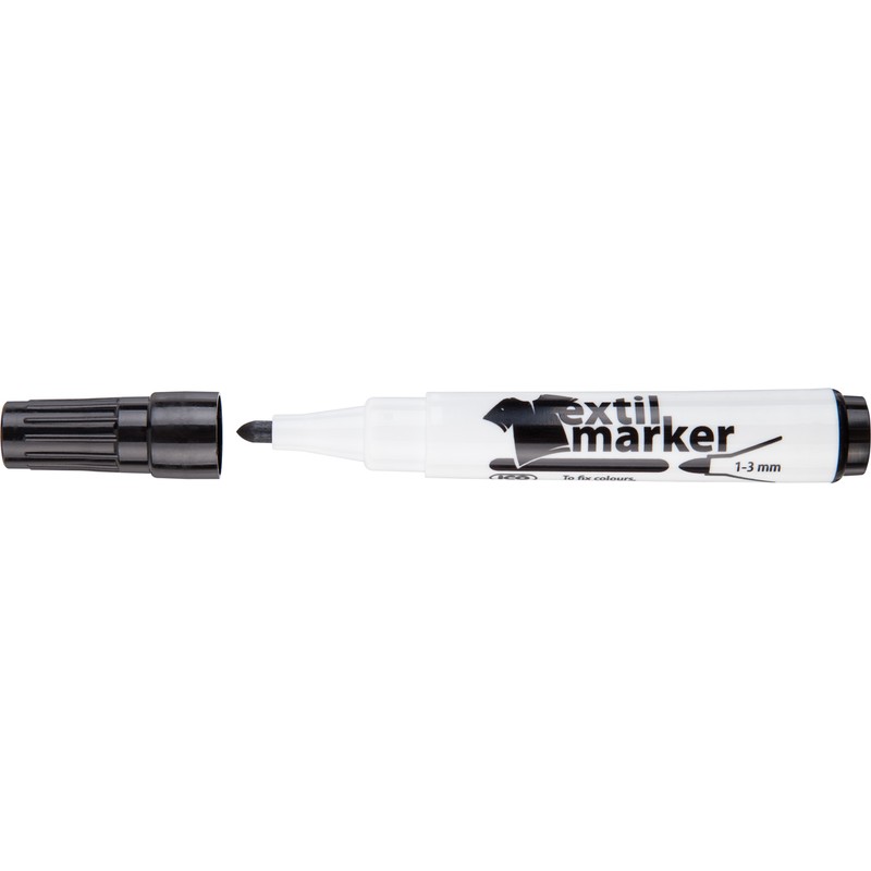Маркер по ткани ICO заправлен чернилами черного цвета на водной основе. Подходит практически для всех видов ткани, толщина линии — 1-3 мм. Для закрепления надписей и рисунков рекомендуется прогладить изделие утюгом при температуре не выше 62 градусов (без пара).