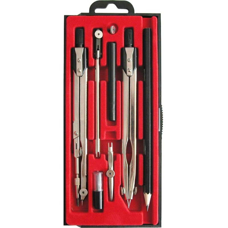 В набор входят 8 предметов: циркуль чертежный большой, измеритель, удлинитель, вставка игольная малая, пенал малый,