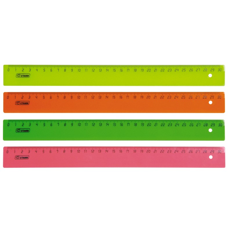 30-сантиметровая линейка Стамм выполнена из полистирола. Линейка предназначены для чертежных работ. Прозрачные, флуоресцентные цвета: розовый, желтый, зеленый, оранжевый.