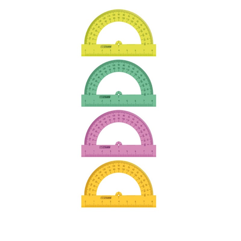 Транспортир «Стамм» изготовлен из прозрачного пластика. Имеет 180-градусную шкалу. Нижняя часть представляет собой линейку длиной 8 см. Шкалы и логотип нанесены на транспортир с помощью термопечати. Предназначены для чертежных работ.