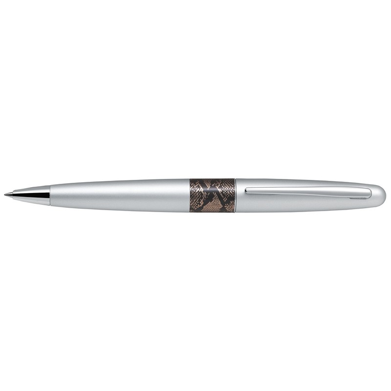 Автоматическая шариковая ручка Pilot из серии «Дикие животные», «Стальной питон». Модель выполнена в металлическом корпусе серебристого цвета, снабжена специальным поворотным механизмом, выдвигающим и убирающим сменный стержень внутрь. Чернила имеют оптимальную вязкость, что в сочетании с шариком диаметром 0,7 мм позволяет оставлять ровные и мягкие линии на бумаге. Ручка украшена принтом в виде кожи питона, поставляется в подарочной упаковке. Полиграфические характеристики: типы нанесения, который возможен на данную модель: тампопечать.