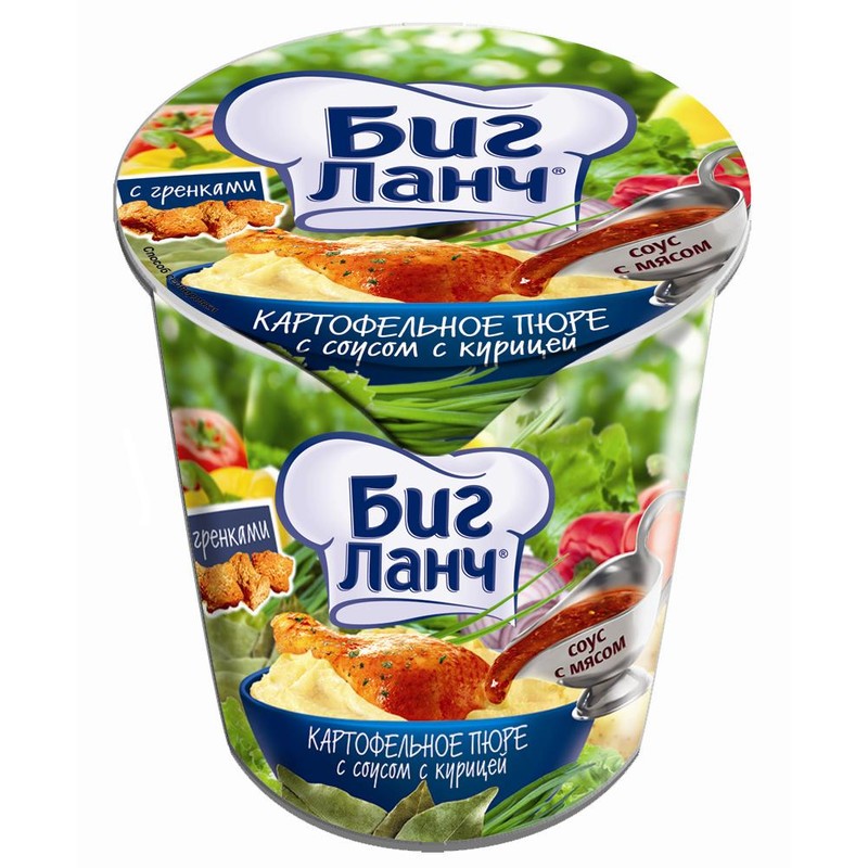 Картофельное пюре быстрого приготовления «Биг ланч» с соусом и курицей. Густой соус приготовлен из натурального мяса и отборных овощей. Упаковка в форме стаканчика.