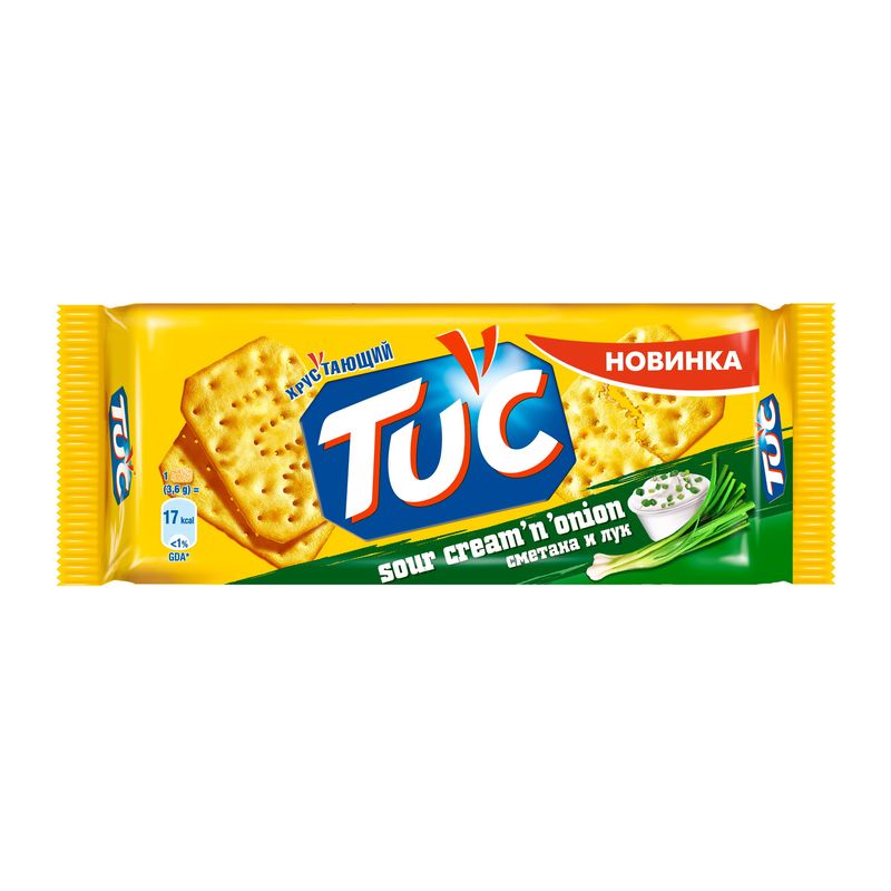 Крекер TUC со вкусом сметаны и лука готовится из натуральных ингредиентов с добавлением соли и специй. Продукт запекается по особой технологии, за счет чего хрустит и тает во рту. Печенье поставляется в мягкой упаковке. Вес 100 г.