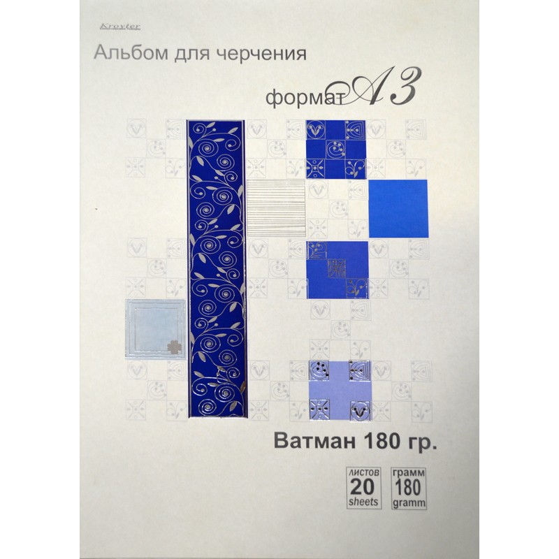 Альбом для черчения Kroyter «Стиль» формата А3 имеет обложку из мелованного картона с тиснением золотой фольгой. Состоит из 20 листов белого ватмана плотностью 180 г/кв.м, скрепленных с помощью склейки.