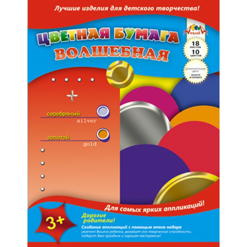 Цветная бумага «Апплика» предназначена для детского творчества, рекомендована от трех лет. Красочная обложка из офсета, дизайн в ассортименте. Блок, скрепленный скобами, состоит из 18 листов мелованной цветной бумаги десяти цветов. В набор входят следующие цвета: желтый, красный, черный, розовый, зеленый, фиолетовый, синий, малиновый, золотой, серебряный.