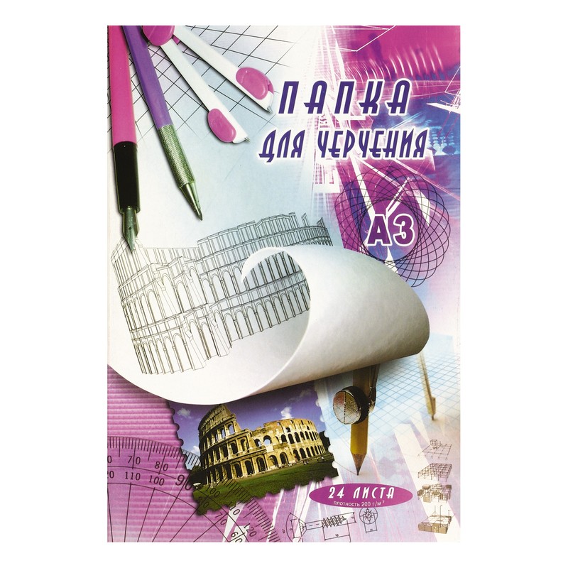 Папка для черчения с 3-клапанной обложкой из мелованного картона. Состоит из 24 листов белого ватмана плотностью 200 г/кв.м. Формат А3. Подходит для черчения и художественных работ.