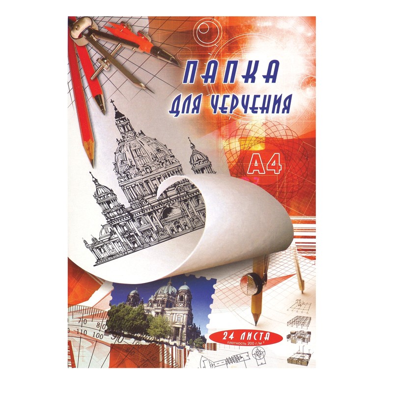 Папка для черчения с 3-клапанной обложкой из мелованного картона. Состоит из 24 листов белого ватмана плотностью 200 г/кв.м. Формат А4. Подходит для черчения и художественных работ.