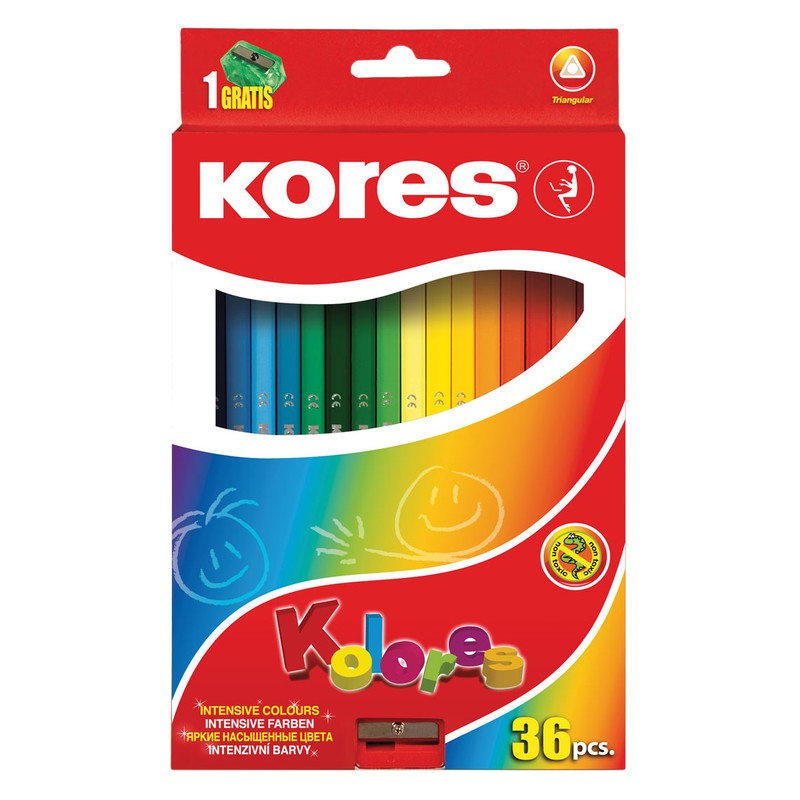 Цветные карандаши Kores имеют насыщенные цвета. Трехгранная форма корпуса снижает усталость и придает дополнительный комфорт. Грифель проклеен по все длине корпуса. Карандаши предназначены для детей от 3-х лет. Длина каждого — 17,5 см, толщина грифеля — 2,9 мм. В картонном футляре 36 цветных карандашей и точилка.