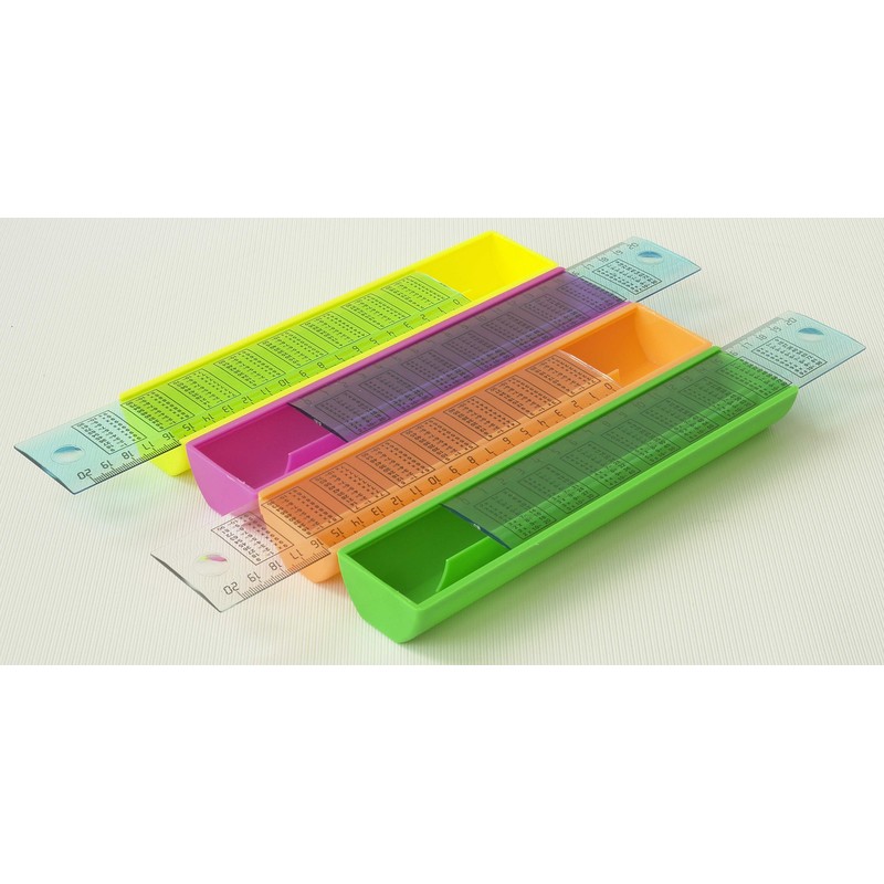 Пенал UNI изготовлен из прочного пластика, крышка оформлена в виде линейки. Пенал предназначен для хранения письменных и канцелярских принадлежностей, имеет одно отделение.