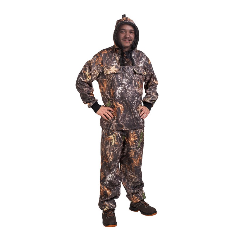 • Костюм «Антигнус» с капюшоном и противомоскитной сеткой, убираемой в потайной нагрудный карман. Прямые брюки стянуты эластичной тесьмой в притачном поясе и по низу. Модель изготовлена из комбинированной ткани «Грета» плотностью 220 г/кв.м, состоящей на 51% из полиэфира и на 49% из хлопка. Размер костюма — 44-46 при росте модели от 182 до 188 см.