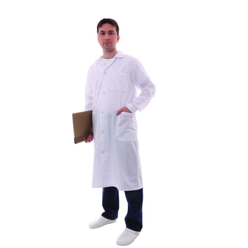 Мужской халат «Медик» белого цвета с отложным воротником. Классическая модель изготовлена из смесовой ткани плотностью 120 г/кв.м, состоящей на 65% из полиэфира и на 35% из хлопка. Застежка центральная, на пуговицах; на лицевой стороне расположены два накладных кармана. Размер халата— 52-54 при росте модели от 182 до 188 см.