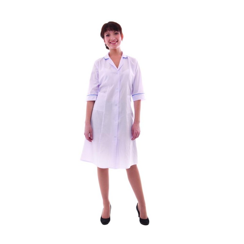 Женский халат «Ника» белого цвета с центральной застежкой на пуговицы. Классическая модель выполнена из смесовой ткани плотностью 120 г/кв.м, состоящей на 65% из полиэфира и на 35% из хлопка. На лицевой стороне имеются три накладных кармана — один нагрудный и два нижних. Воротник отложной. Размер халата — 60-62 при росте от 158-164 см.