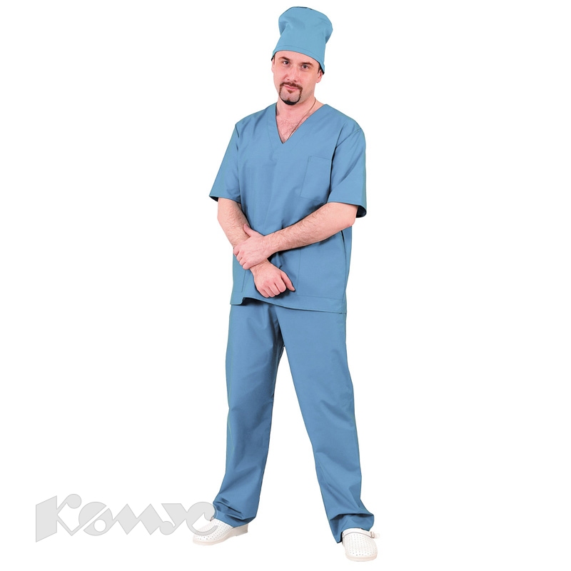 Костюм хирурга изготовлен из ткани голубого цвета, состав — 65% полиэфира и 35% хлопка. Состоит из куртки и брюк, подходит и для женщин, и для мужчин. Размер — 44-46, рост — 170-176 см. Куртка с коротким рукавом и нагрудным карманом, свободный покрой обеспечивает удобство в работе. Брюки прямые на резинке.