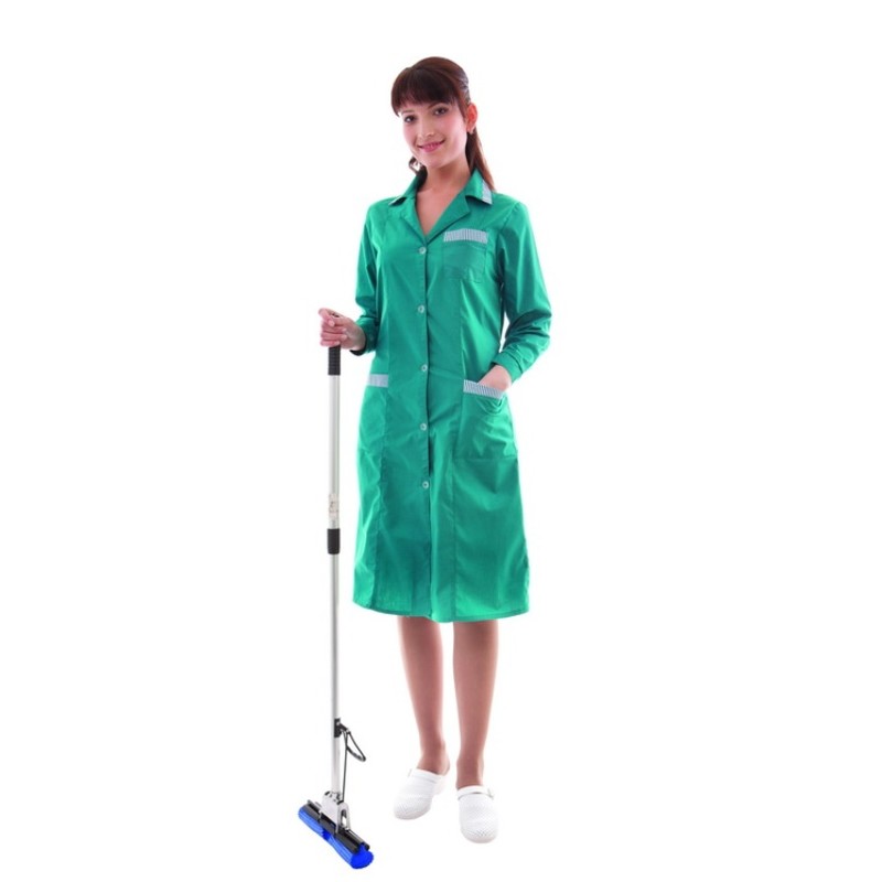 Женский халат для торговли и сферы обслуживания «Вилора», размер 52-54, рост 170-176 см. Изготовлен из ткани бирюзового цвета, состав — 65% полиэфира и 35% хлопка. Рукав длинный. Воротник отложной с лацканами, есть накладные карманы. Отлет воротника, верхние части карманов и края рукавов отделаны светлой тканью. Халат застегивается на пуговицы.