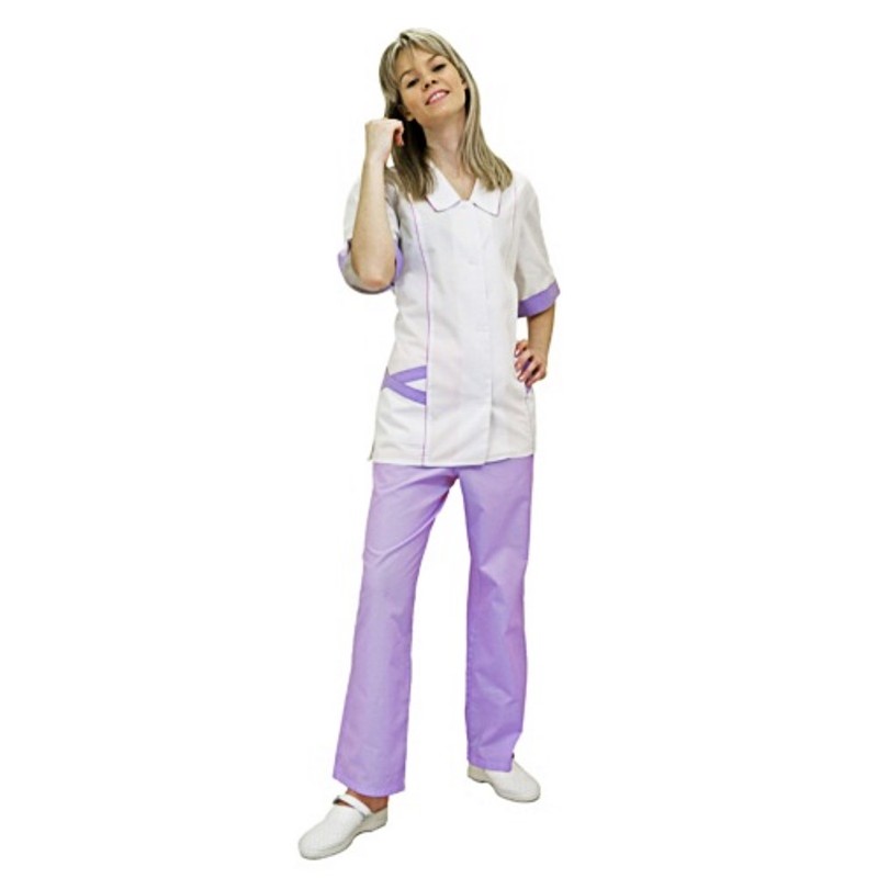 • Костюм медицинского работника. В комплект входит белая куртка с сиреневой отделкой и брюки сиреневого цвета. В куртке с отложным воротником, короткими рукавами и застежкой на пуговицы предусмотрены два нижних кармана. Брюки имеют свободный покрой и пояс на резинке. Костюм сшит из смесовой ткани (65% полиэстер, 35% хлопок). Плотность материала составляет 120 г/кв.м, благодаря чему обеспечивается легкость изделия.