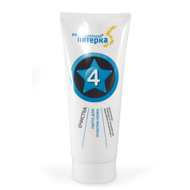«Великолепная пятерка № 4» — паста для очистки кожи от особо устойчивых загрязнений. Используется после работ с масляной краской, лаками, смолами, клеем, силиконом, монтажной пеной и другими веществами. Обеспечивает глубокую, но щадящую чистку. Не содержит мыла и силикона. В состав входят увлажняющие компоненты. Один-два миллилитра средства необходимо нанести на загрязненные участки без добавления воды, втирать в течение 20 секунд, затем растереть с добавлением небольшого количества воды и смыть. Упаковка — туба объемом 200 мл.