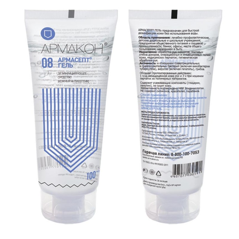 «Армасепт гель» — простое и удобное средство для защиты рук с антисептическим эффектом. Густая жидкость на спиртовой основе значительно облегчает гигиенические процедуры в местах, удаленных от санитарно-бытовых узлов. Гель рекомендован к использованию на работах с повышенным уровнем загрязненности, с документами и деньгами, в медицинских учреждениях, пищевой промышленности и т. п. Объем 100 мл.