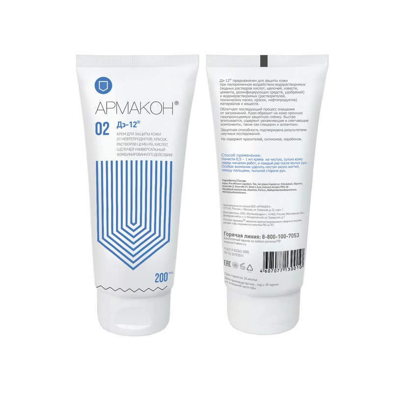 Название торговой марки Армакон Торговая марка Армакон Страна происхождения Россия Схема вложения 30 Применение защита кожи от водорастворимых и водонерастворимых веществ Тип средства крем Объем упаковки 200 мл Артикул 156588 -