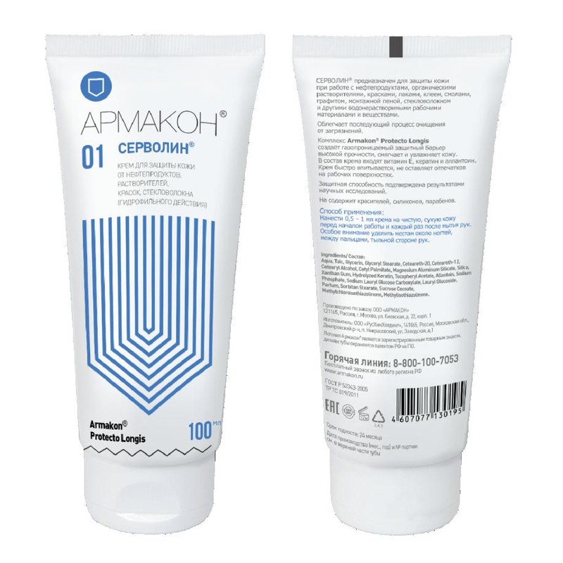 Защитный крем «Серволин» позволяет облегчить очистку рук после работы с красками, лаками, смолами, пенами и клеями. Создает тонкую пленку, не оставляющую жирных следов на рабочих поверхностях.