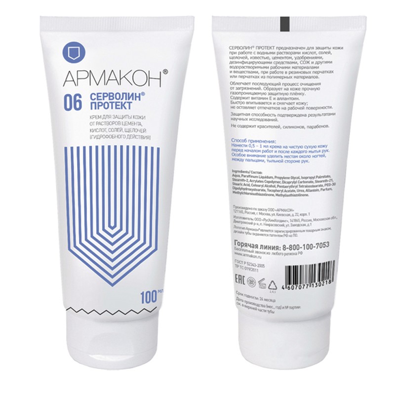 Защитный крем «Серволин Протект» предназначен для защиты рук от воздействия водных растворов кислот, щелочей и других опасных соединений. Наносится на сухую кожу, создает тонкую пленку, предотвращающую проникание воды. В составе крема содержатся питательные вещества, обеспечивающие дополнительный уход за кожей рук.